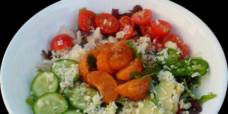 Vistas krūtiņu sagriežat un apcepiet uz sausas pannas. Piparu sagriežat pusgredzenos, gurķi ripiņās, tomātus četrās daļās. Pievienojiet spinātus, mandarīnus, rīvētu sieru un samaisiet ar eļļu.