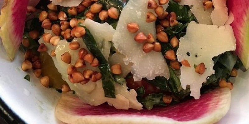 Griķus aplejiet ar vārošu ūdeni (1 daļa griķu un divas daļas ūdens) un atstājiet uz 6 – 8 stundām. Sagriežat puravu, sarīvējiet parmezānu, salātu lapas sapluciniet gabaliņos.